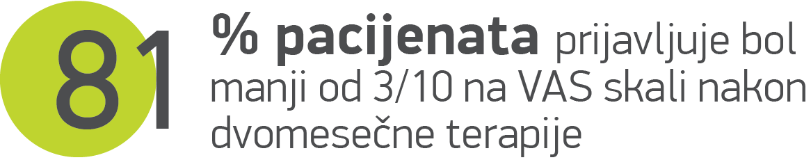 • čak 81% pacijenata prijavljuje bol manji od 3/10 već u prva dva meseca